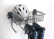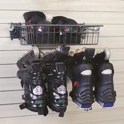 Holds all skating gear in one place. Stores two pairs of inline or ice skates. Integrated basket holds gloves, pucks, guards, and other skating equipment. Coated accessory hooks secure hockey sticks.