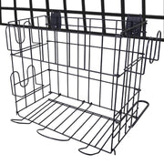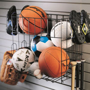 Large basket stores wide assortment of balls with easy front access. Shoe racks can hold three pairs of athletic shoes, gloves, or hats. Side rack conveniently holds up to four bats. Fits slat products & grid products.